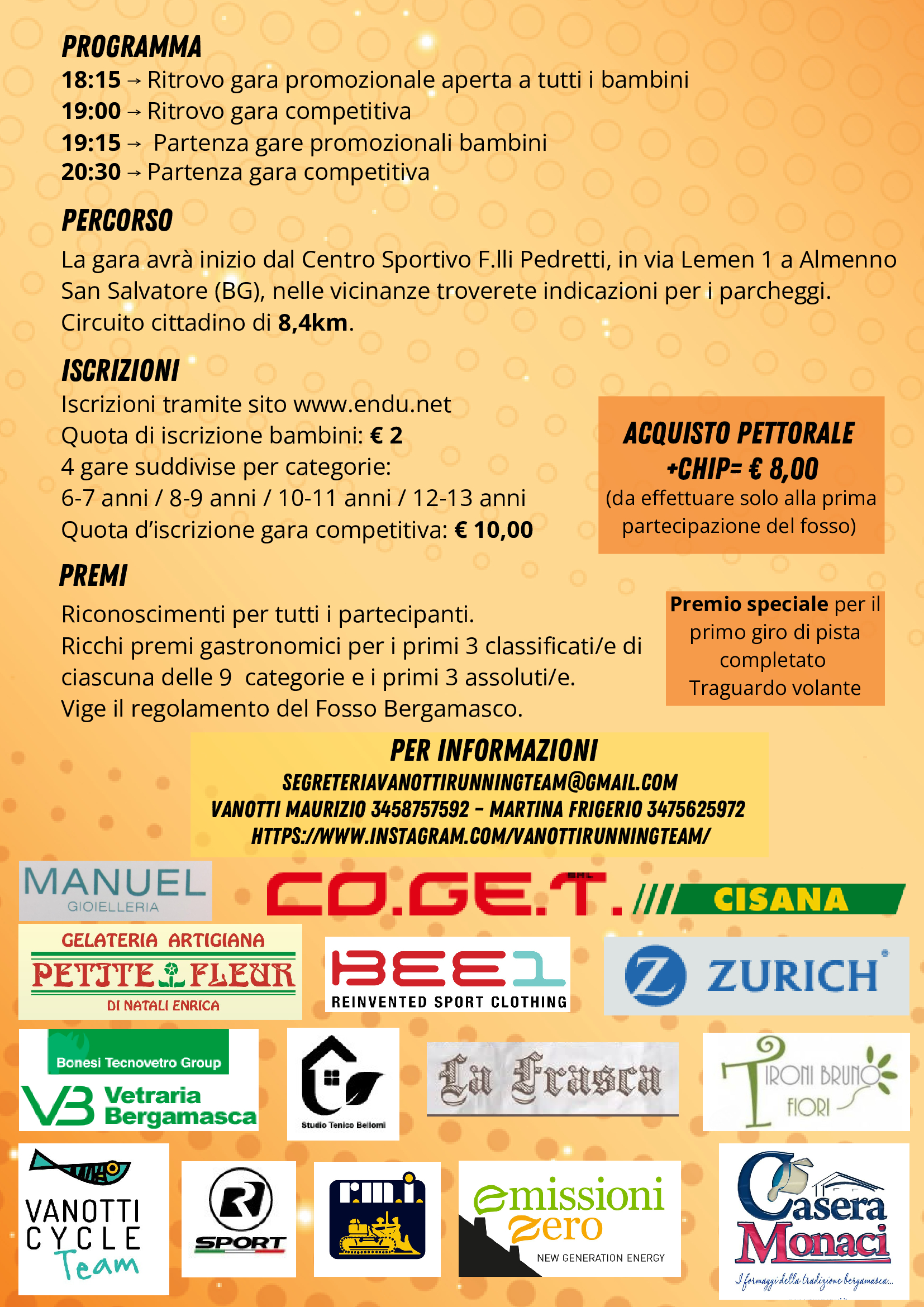 Memorial Vanotti Luigi – 3° tappa del Circuito di Fosso Bergamasco Criterium 2026 Data: 05/06/2026 Località: Almenno San Salvatore (Bg) 🏆 📌 Luogo: Lombardia / Bergamo⏰ Orario: 8,30📏 Distanza (max): 8.4 km📍 Indirizzo: Almenno San Salvatore, Bergamo, Lombardia, 24031, Italia🔗 Sito: https://fossobergamasco.it/Descrizione: Km 8,4 Volantino / Regolamento