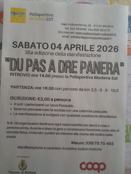 Modena – (MO) – Du Pas a Dre Panera Data: 04/04/2026 Località: Modena ⏰ Orario: 16:00📏 Distanza (max): 10.5 km📍 Indirizzo: Via Indipendenza 25 Modena📞 Telefono: 338 7075403Descrizione: Km 10,5 - Km 9 - Km 6 - Km 3,5 Volantino / Regolamento