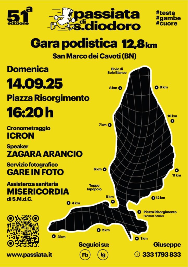 Passiata di San Diodoro Data: 14/09/2025 Località: Benevento (BN) 🏆 🏅 Classifica: Clicca qui 📌 Luogo: Campania / Benevento⏰ Orario: 16:20📍 Indirizzo: San marco dei cavotiDescrizione: Km 12,800 Volantino / Regolamento
