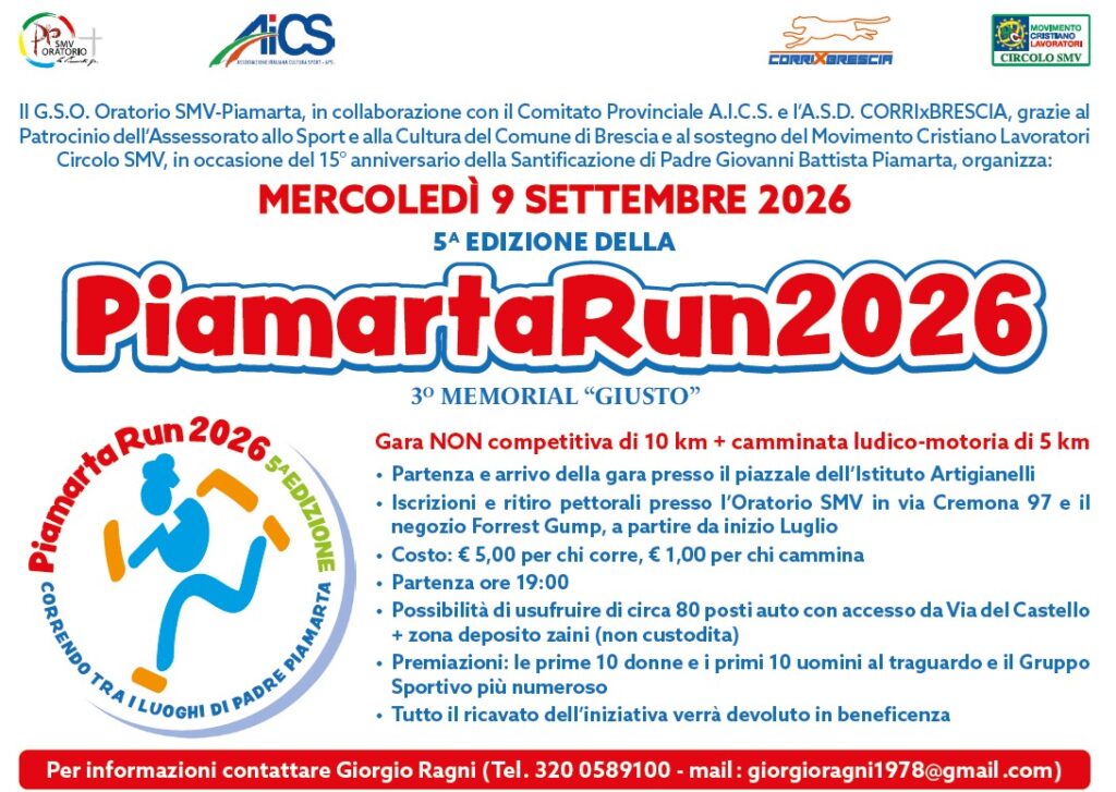 Descrizione: Gara podistica NON competitiva di 10 km (2 giri di 5 km con salita delm Castello di Brescia) e camminata ludico motoria di 5 km