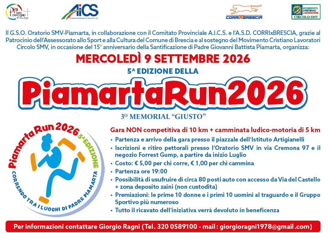 Inscrizioni direttamente alla partenza presso l'Ist. Artigianelli (con in gresso anche da via Piamarta) fino alle 18e50 del giorno di gara