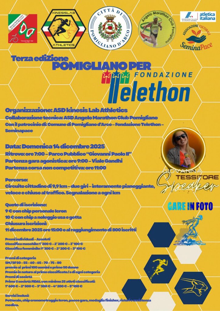 3′ Pomigliano Per Telethon Data: 14/12/2025 Località: Pomigliano d'Arco (NA) 🏅 Classifica: Clicca qui 📌 Luogo: Campania / Napoli⏰ Orario: 09:00📍 Indirizzo: via ghandi pomigliano Volantino / Regolamento