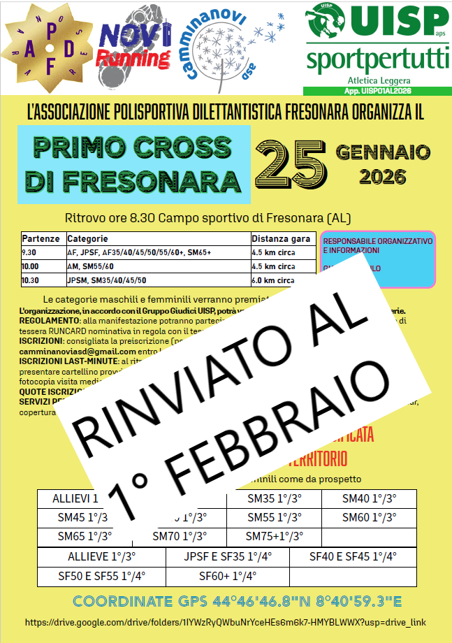 Primo Cross di Fresonara Data: 01/02/2026 Località: Fresonara (Al) 🏆 🏅 Classifica: Clicca qui 📌 Luogo: Piemonte / Alessandria⏰ Orario: 9,30📍 Indirizzo: Campo Sportivo Fresonara alessandria📧 Email: camminanoviasd@gmail.comDescrizione: distanze diverse per categoria Volantino / Regolamento