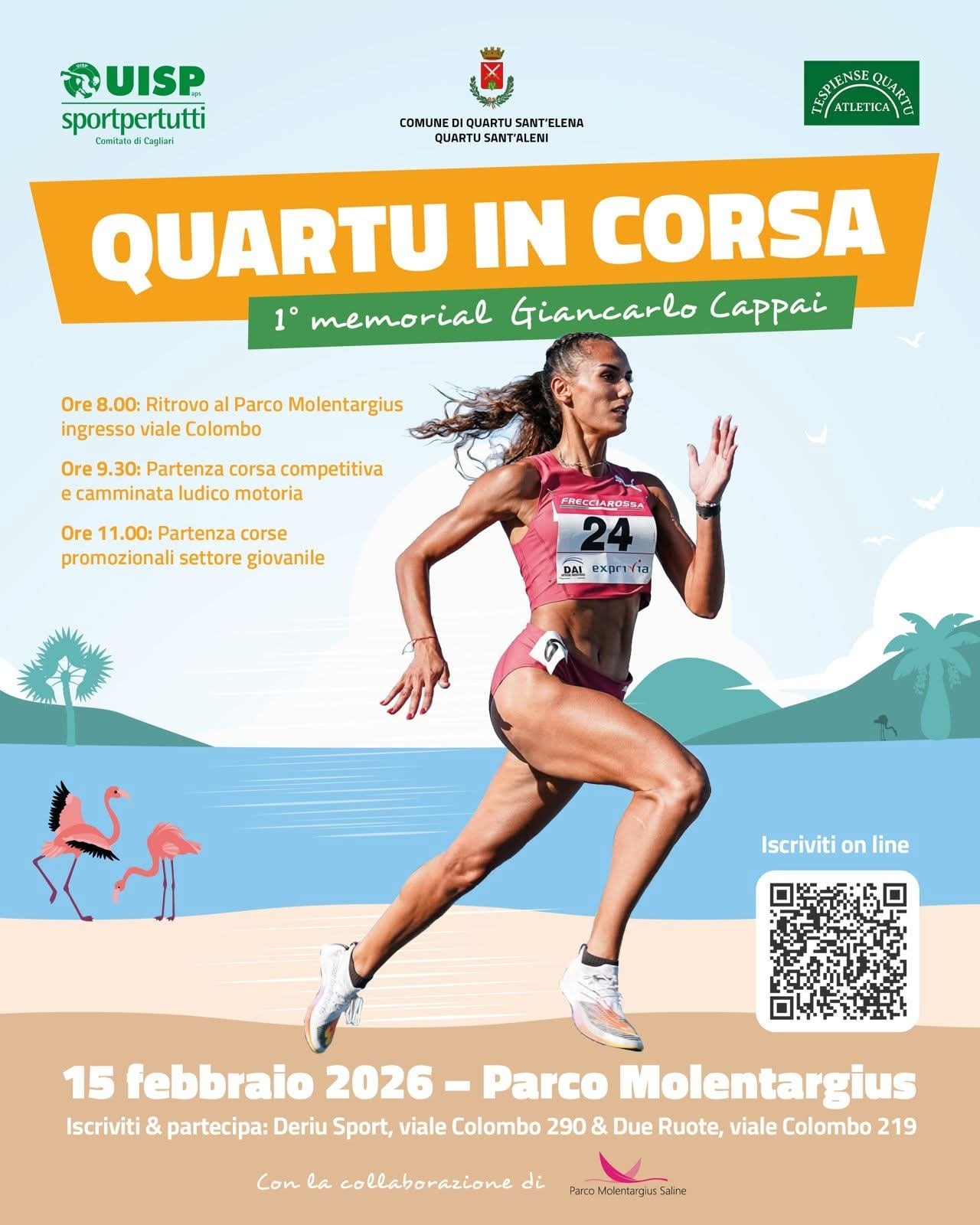 Quartu in corsa Data: 15/02/2026 Località: Quartu Sant'Elena 🏆 📌 Luogo: Sardegna / Cagliari📏 Distanza (max): 9.9 km📝 Iscrizione: https://www.avaibooksports.com📧 Email: cagliari@uisp.it Volantino / Regolamento