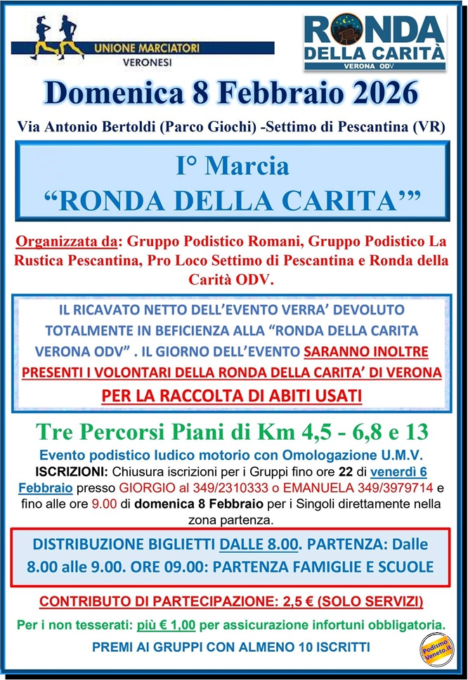Ronda della Carita’ Data: 08/02/2026 Località: Settimo di Pescantina (Vr) 📌 Luogo: Veneto / Verona⏰ Orario: 8,00-9,00📏 Distanza (max): 13 km📍 Indirizzo: Via Antonio Bertoldo Settimo di Pescantina (Vr)Descrizione: Km 13 - Km 6,8 - Km 4,5 Volantino / Regolamento