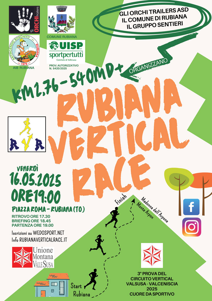 Rubiana Vertical Race Data: 16/05/2025 Località: Torino (TO) 🏆 🏅 Classifica: Clicca qui 📌 Luogo: Piemonte / Torino⏰ Orario: 19:00📍 Indirizzo: Piazza Roma - - Rubiana (TO)🔗 Sito: https://www.rubianaverticalrace.it/📧 Email: rubianaverticalrace@gmail.com Volantino / Regolamento