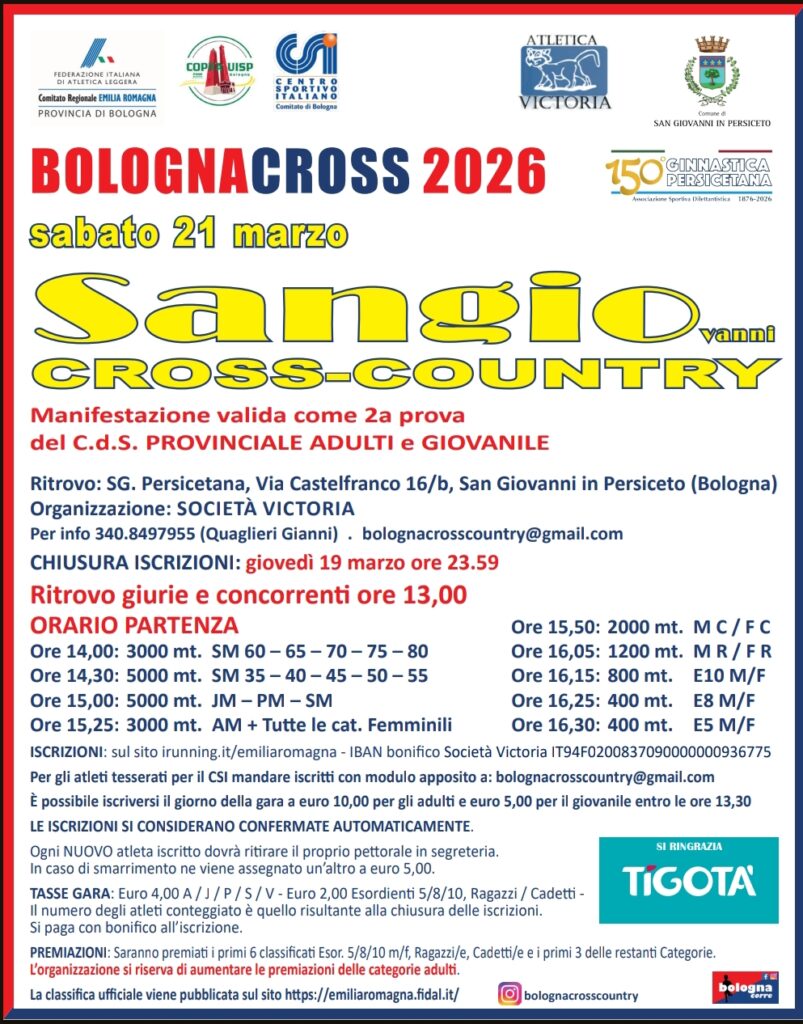 Sangio Cross-Country Data: 21/03/2026 Località: San Giovanni in Persiceto (Bo) 🏆 📌 Luogo: Emilia-Romagna / Bologna📏 Distanza (max): 5 km📧 Email: bolognacrosscountry@gmail.com📞 Telefono: 340.8497955Descrizione: Cross su varie distanze. Inizio gare ore 14:00 c/o il Centro Sportivo in via Castelfranco 16/b Volantino / Regolamento