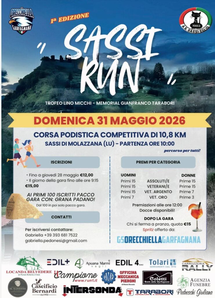 SASSI Run Data: 31/05/2026 Località: Sassi (Molazzana) 🏆 📌 Luogo: Toscana / Lucca⏰ Orario: 10:00📏 Distanza (max): 11 km📍 Indirizzo: Sassi, Molazzana, Lucca, Toscana, 55032, Italia🔗 Sito: www.gsorecchiellagarfagnana.com📞 Telefono: +39 329 217 0671Descrizione: 2 giri di 5.5 km /cad. ca.