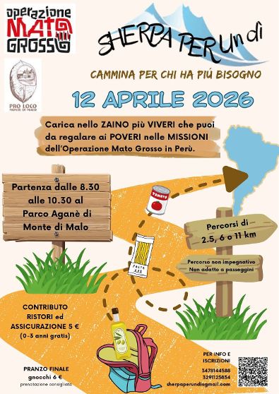 Sherpa per un dì (11-6-2,5Km) Data: 12/04/2026 Località: Monte di Malo (Vi) 📌 Luogo: Veneto / Vicenza📏 Distanza (max): 15 km📞 Telefono: 347.8144588Descrizione: Non competitiva benefica di Km11-km-6 -Km 2,5 Partenza ore 08:30/10:30 c/o il Parco Natura Aganè, via Vanzi Volantino / Regolamento