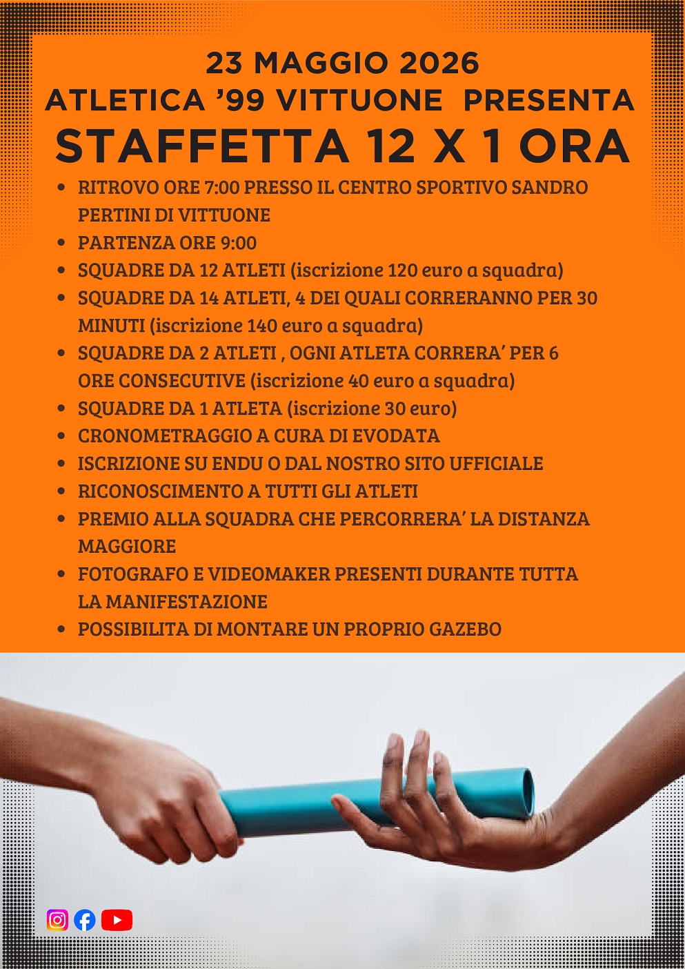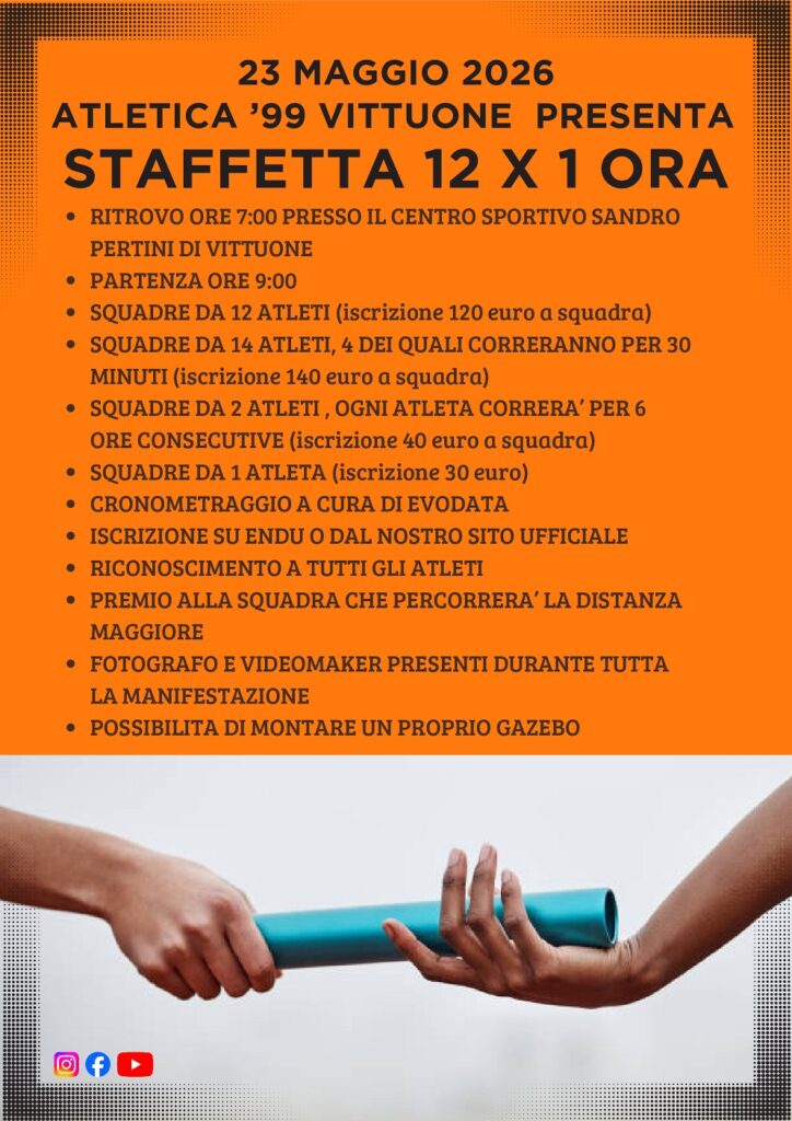 Staffetta 12x1H di Vittuone Data: 23/05/2026 Località: Vittuone (Mi) 📌 Luogo: Lombardia / Milano📍 Indirizzo: centro sportivo Sandro Pertini di Vittuone📧 Email: atletica99vittuone@hotmail.com Volantino / Regolamento