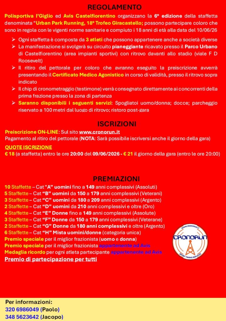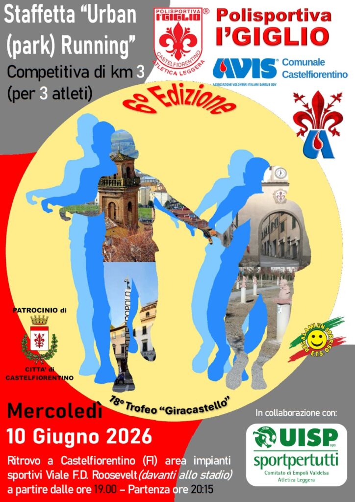 Descrizione: 6° edizione della Staffetta "Urban (park) running", 18° trofeo "Giracastello", competitiva di 3Km per 3 atleti che possono appartenere anche a società diverse; ritrovo a Castelfiorentino, viale F.D. Roosevelt (area impianti sportivi) con ampio parcheggio, spogliatoi uomini e donne, servizio docce; percorso pianeggiante ricavato interamente nel parco urbano cittadino, ritrovo a partire dalle ore 19.00; partenza (tutte le categorie) ore 20:15