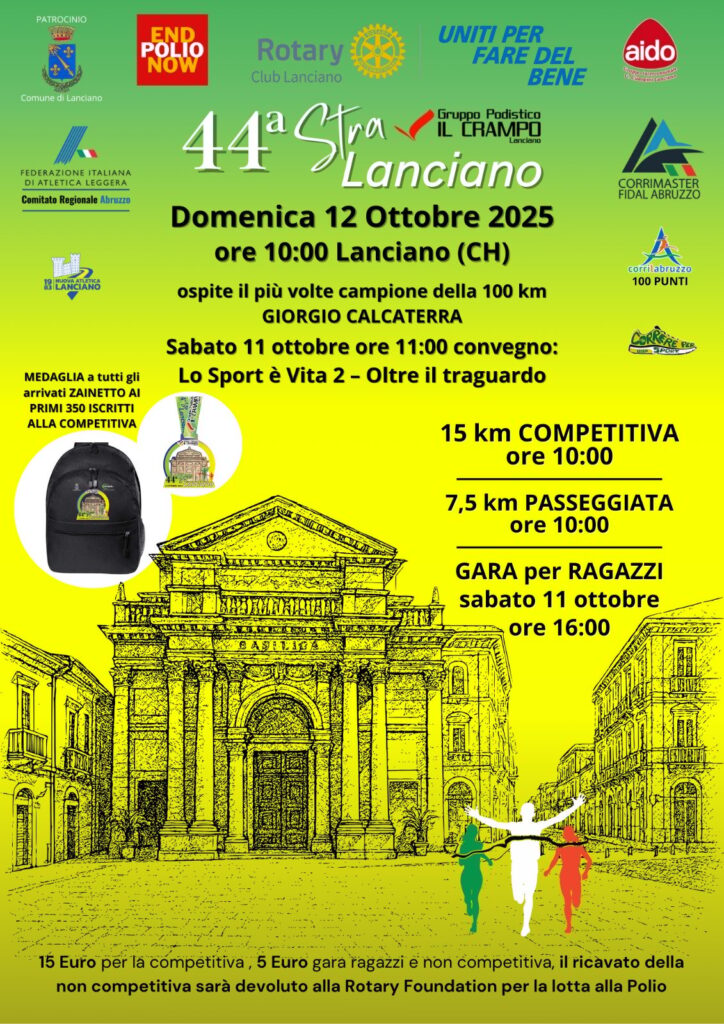 Stralanciano Data: 11/10/2025 Località: Chieti (CH) 🏆 🏅 Classifica: Clicca qui 📌 Luogo: Abruzzo / Chieti⏰ Orario: 10:00📍 Indirizzo: LancianoDescrizione: Km 15 competitiva Km 7,5 non competitiva Volantino / Regolamento