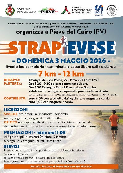 Strapievese (12-7Km) Data: 03/05/2026 Località: Pieve del Cairo (Pv) 📌 Luogo: Lombardia / Pavia⏰ Orario: dalle 8,30 alle 9,30📏 Distanza (max): 12 km📍 Indirizzo: Via Roma, Cairo Lomellina, Pieve del Cairo, Pavia, Lombardia, 27037, ItaliaDescrizione: Km 12 - Km 7 ludico motoria Volantino / Regolamento