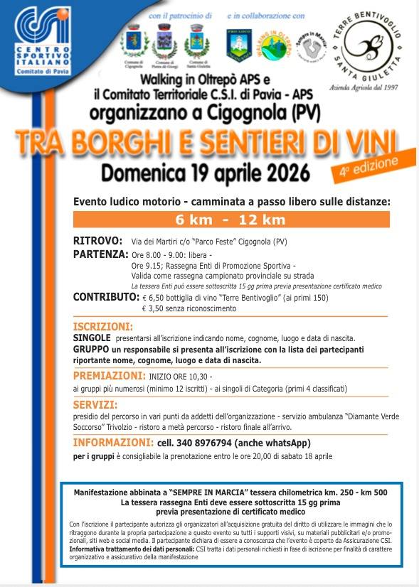 Descrizione: Competitiva di Km 12 e ludico motoria di Km 12 e Km 6. Partenza ore 09:15 (ludico motoria ore 08:00/09:00) c/o il parco feste Pro Loco di Cigognola, via dei Martiri