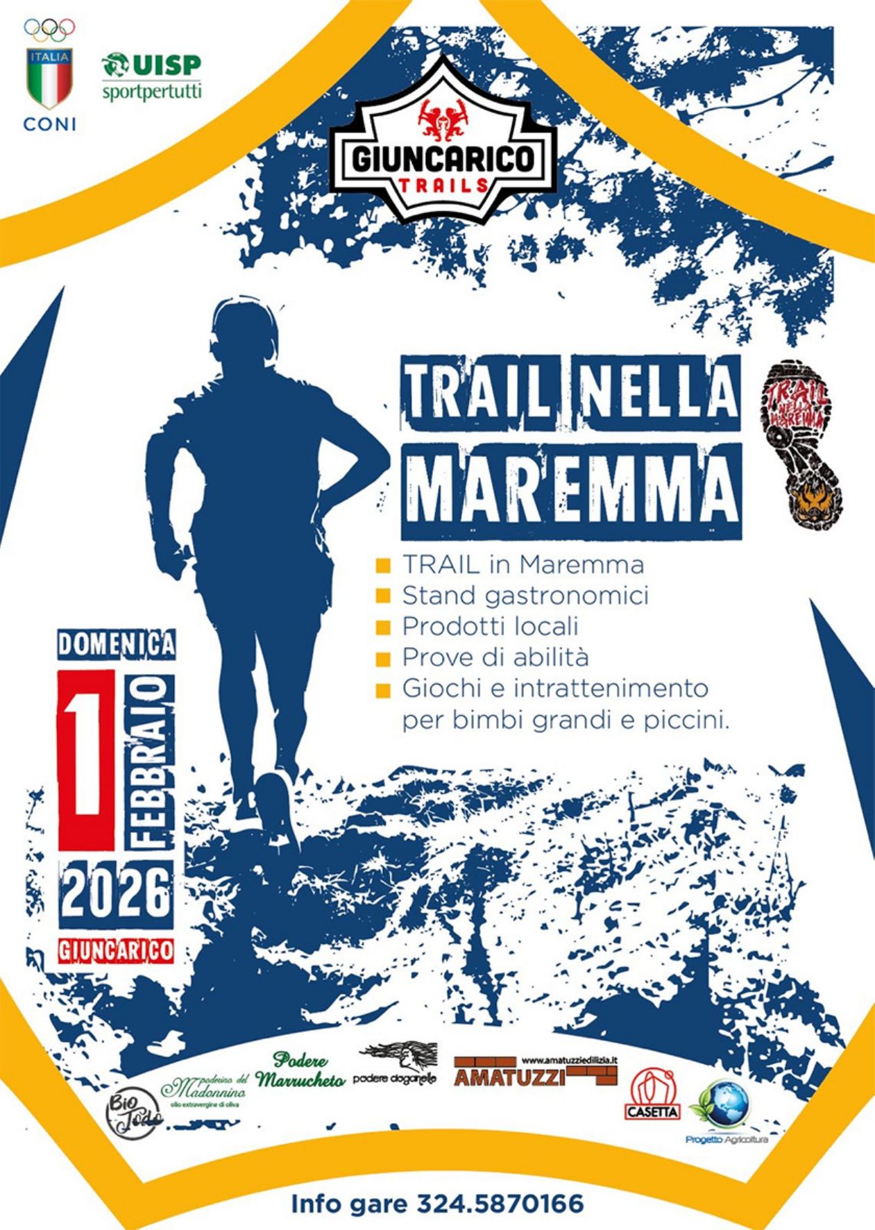 Trail nella Maremma Data: 01/02/2026 Località: Giuncarico - Gavorrano (Gr) 🏆 📌 Luogo: Toscana / Grosseto📏 Distanza (max): 19 km📧 Email: mtb@giuncaricotrails.com📞 Telefono: 324.5870166 - 339.4795283Descrizione: Trail di Km 19 (D+650m). Partenza ore 10:30 da via Roma Volantino / Regolamento