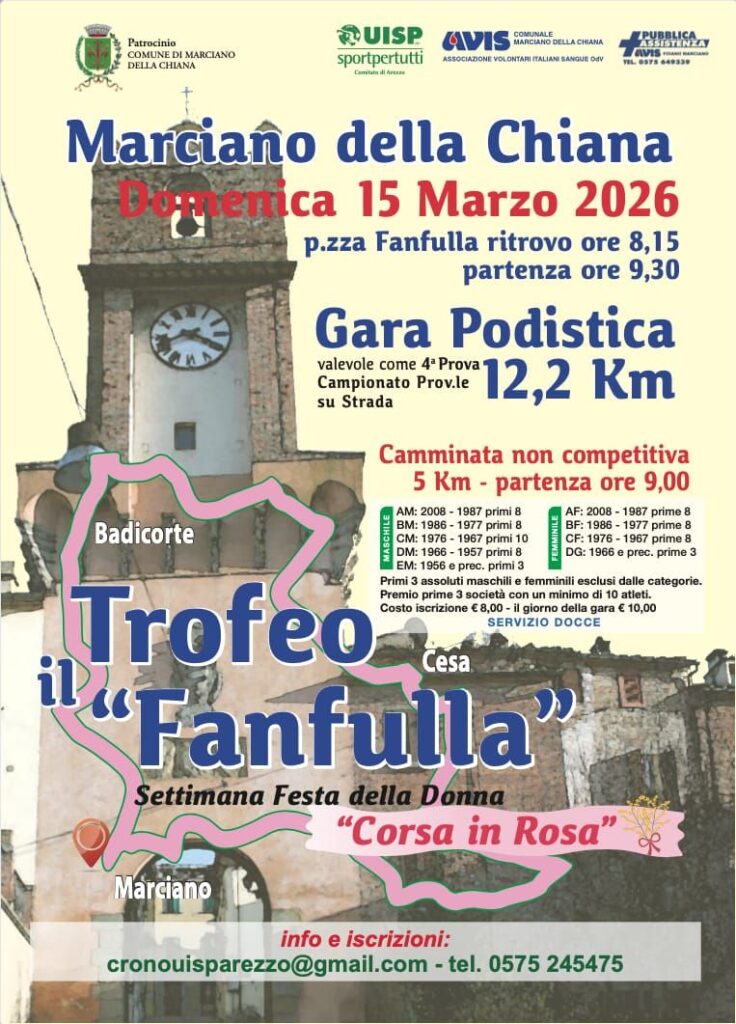 Trofeo Il Fanfulla Data: 15/03/2026 Località: Marciano della Chiana (Ar) 🏆 📌 Luogo: Toscana / Arezzo📏 Distanza (max): 12.2 km📧 Email: inforevolutionrunners@gmail.com📞 Telefono: 347.4817208Descrizione: Competitiva di Km 12,2 e non compet. di Km 5. Partenza ore 09:30 (Km 5 ore 09:00) da Piazza Fanfulla Volantino / Regolamento