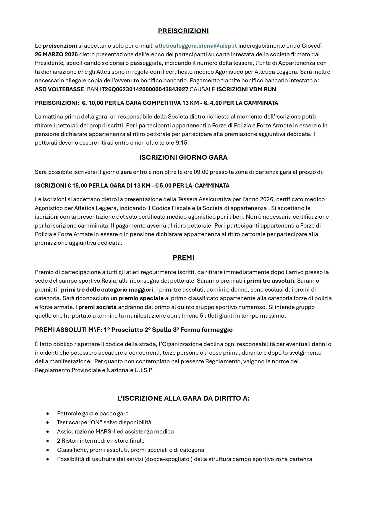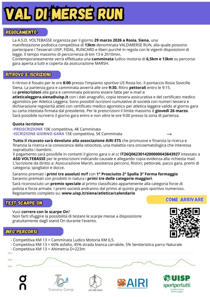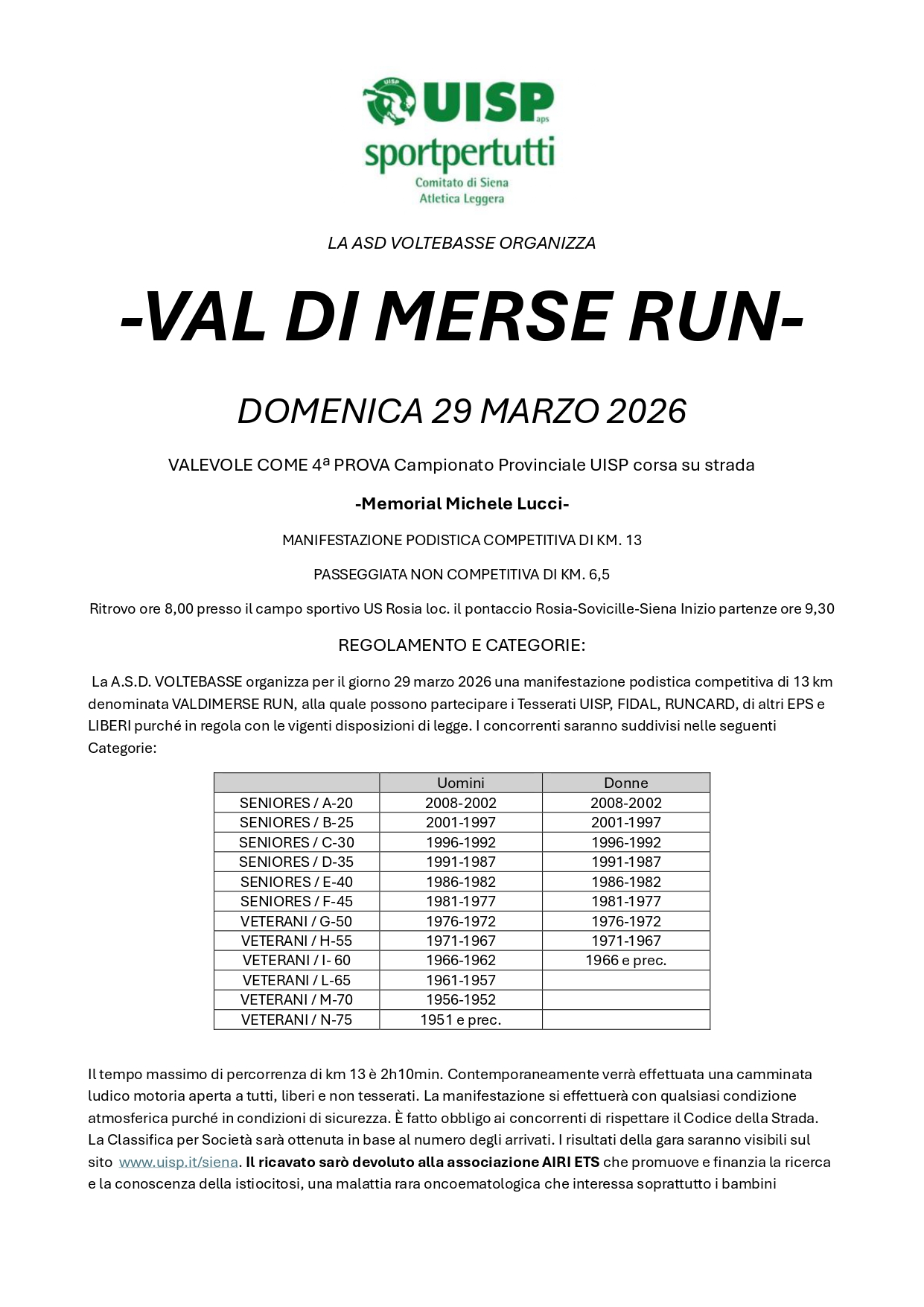 Descrizione: 3^ Edizione Val di Merse Run tra i borghi ed il parco naturale della val di Merse. Campionato provinciale costa su strada.