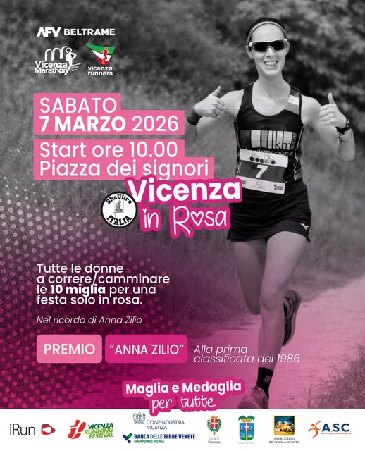 Vicenza In Rosa Data: 07/03/2026 Località: Vicenza (Vi) 🏅 Classifica: Clicca qui 📌 Luogo: Veneto / Vicenza⏰ Orario: 10📏 Distanza (max): 10 kmDescrizione: Km 10 - Km 8 riservata alle donne Volantino / Regolamento