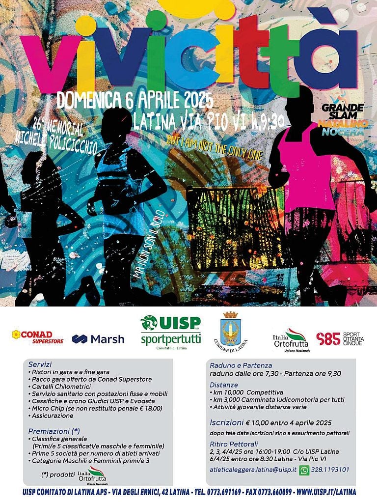 Vivicitta’ Latina Data: 06/04/2025 Località: Latina (LT) 🏆 🏅 Classifica: Clicca qui 📌 Luogo: Lazio / Latina⏰ Orario: 09:30📍 Indirizzo: Piazza del Popolo Latina🔗 Sito: http://www.uisp.it/latina📧 Email: atleticaleggera.latina@uisp.it📞 Telefono: 328.1193101 Volantino / Regolamento