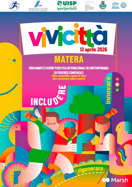 Vivicittà – Matera Data: 12/04/2026 Località: Matera (Mt) 🏆 📌 Luogo: Basilicata / Matera📏 Distanza (max): 9.99 km📞 Telefono: 0835.334076Descrizione: Competitiva di Km 9,99 e ludico motoria di Km 4. Partenza ore 09:30 Volantino / Regolamento