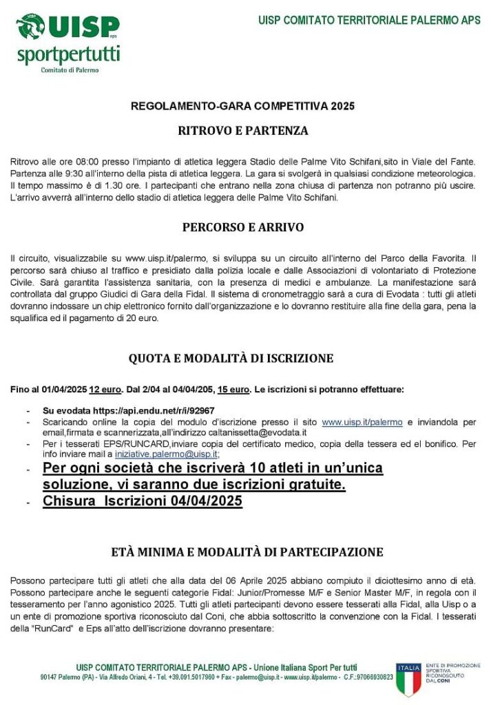 Vivicitta’ Palermo Data: 06/04/2025 Località: Palermo (PA) 🏆 🏅 Classifica: Clicca qui 📌 Luogo: Sicilia / Palermo⏰ Orario: 09:30📍 Indirizzo: Stadio delle Palme Vito Schifani, viale del Fante🔗 Sito: http://www.uisp.it/palermo Volantino / Regolamento